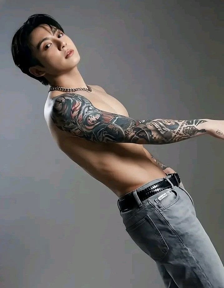 A luz da manhã batia contra a pele dele, destacando cada detalhe da anatomia poderosa do piloto. S/N travou. Seus olhos, contra sua própria vontade, fizeram um mapeamento involuntário: desde a linha dos ombros largos até as tatuagens que desciam pelo braço direito, sumindo no cós da calça de moletom cinza que descansava perigosamente baixa em seus quadris. As cicatrizes leves e os músculos das costas, que se moviam enquanto ele alcançava uma xícara, eram um lembrete visual de que ele não era apenas um “coelho” — ele era uma máquina de alta performance.